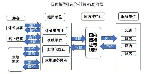 報(bào)價(jià)就有三種情況,一是接待社專線部給外省組團(tuán)社專線部報(bào)價(jià),專線部在向外省組團(tuán)社服務(wù)網(wǎng)點(diǎn)報(bào)價(jià),外省服務(wù)網(wǎng)點(diǎn)在向外省游客報(bào)價(jià)。二是接待社專線部給本地服務(wù)網(wǎng)點(diǎn)、本地代理商報(bào)價(jià),服務(wù)網(wǎng)點(diǎn)和代理商再向本地游客報(bào)價(jià)。三是接待社專線給在線平臺(tái)報(bào)價(jià),在線平臺(tái)給在線游客報(bào)價(jià)。