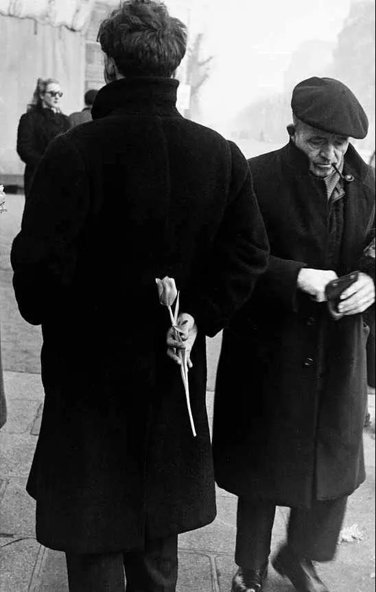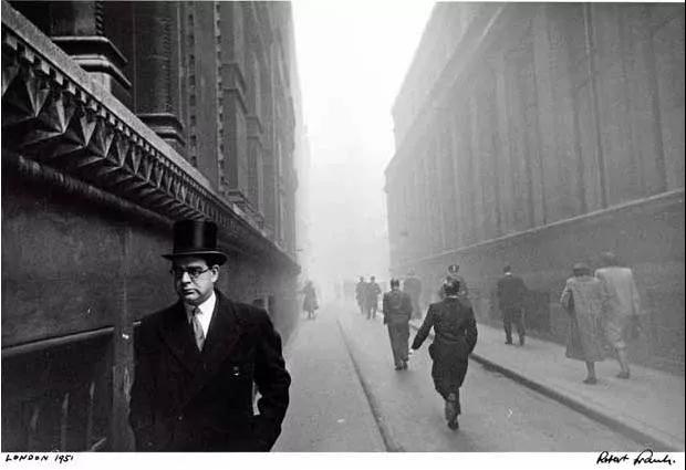 返回紐約后, 1949~1953 年期間,弗蘭克又多次前往歐洲各國(guó),先是拍攝花都巴黎,制作了一本以鮮花為主題的影集,送給他的未婚妻;后來拍攝了英國(guó)倫敦濃霧中銀行家頭戴圓頂禮帽、身著大衣、手持雨傘或手杖來去匆匆的典型英國(guó)人形象,以及滿臉漆黑的威爾士礦工辛苦勞動(dòng)的照片;在西班牙他捕捉到一頭背插匕首的牛面對(duì)斗牛士的精彩畫面。他在每座城市都尋找最有代表性的意象,通過片斷的、稍縱即逝和內(nèi)省的個(gè)人化影像,并將它們作為一個(gè)整體,共同表達(dá)他對(duì)該城市的感受。