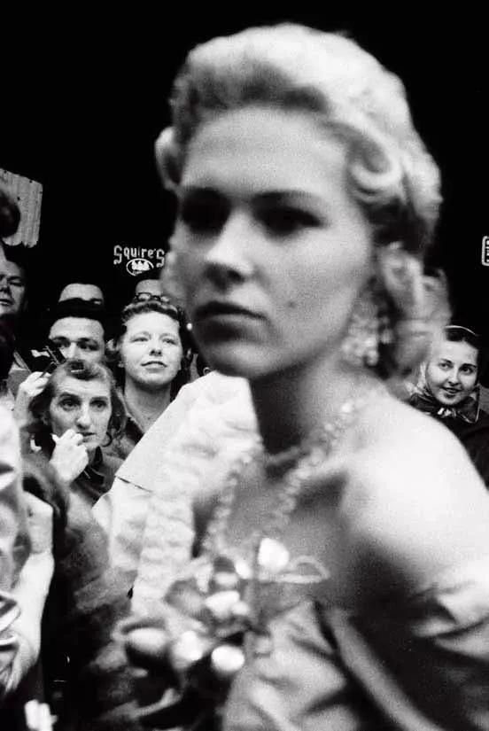 他在擁擠的大街上,在暗淡的酒吧里,在熱鬧的集會(huì)中,甚至在行駛的汽車?yán)铮脧瓶ㄏ鄼C(jī)不搶眼的特點(diǎn)以及高速膠卷、廣角鏡頭和超焦距等便利,完全用現(xiàn)場(chǎng)光,大量搶拍所見到的一切。