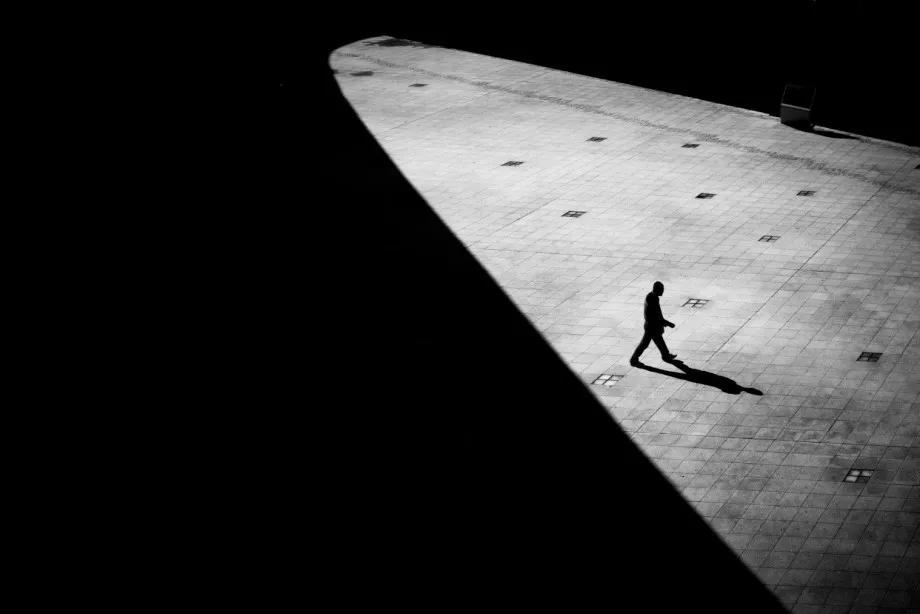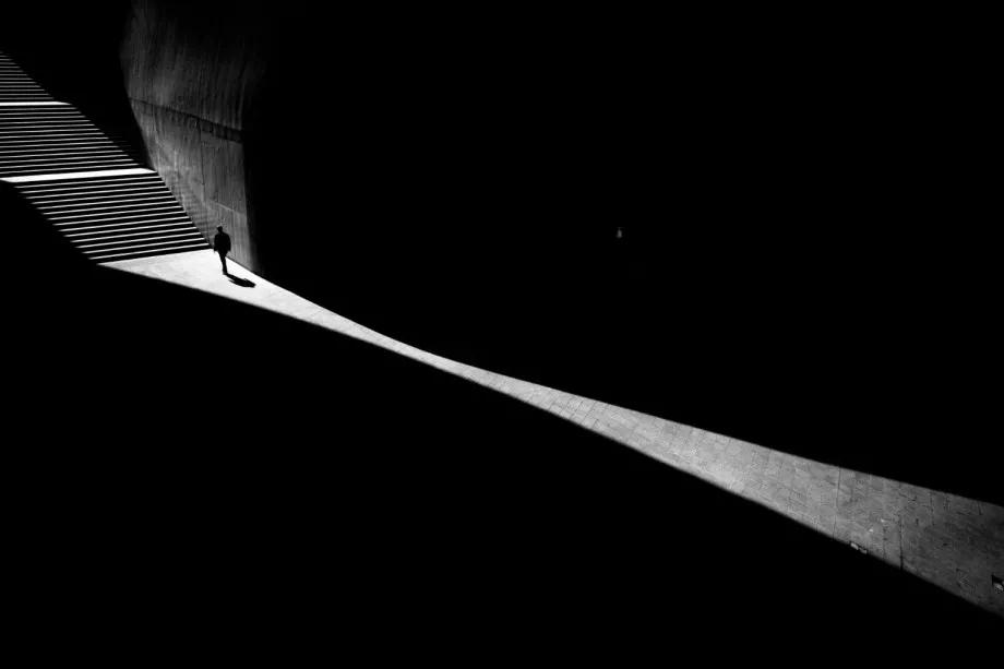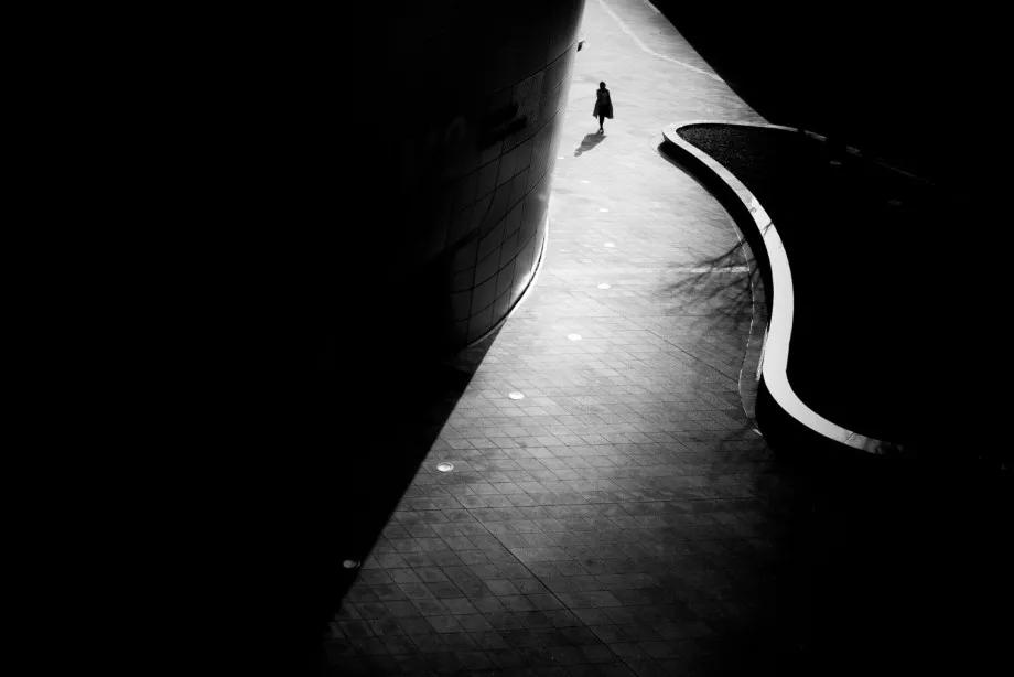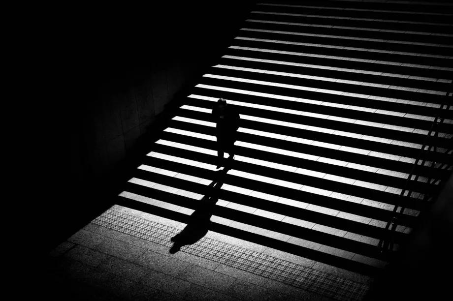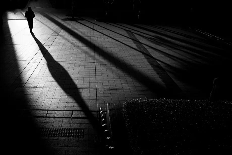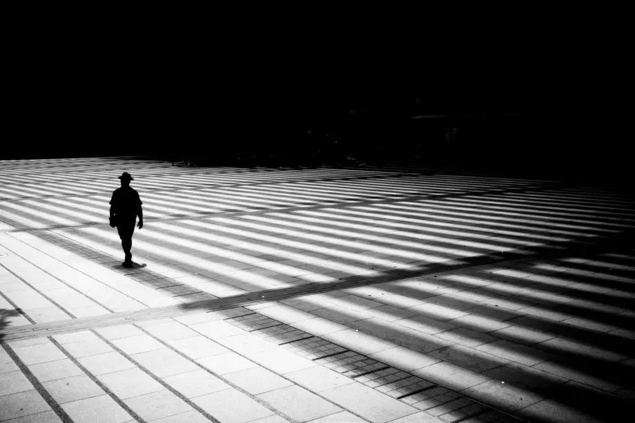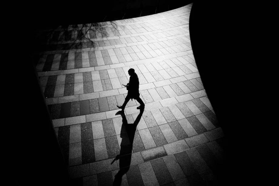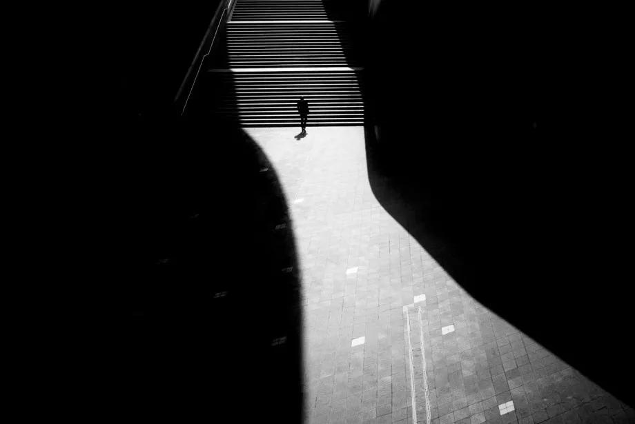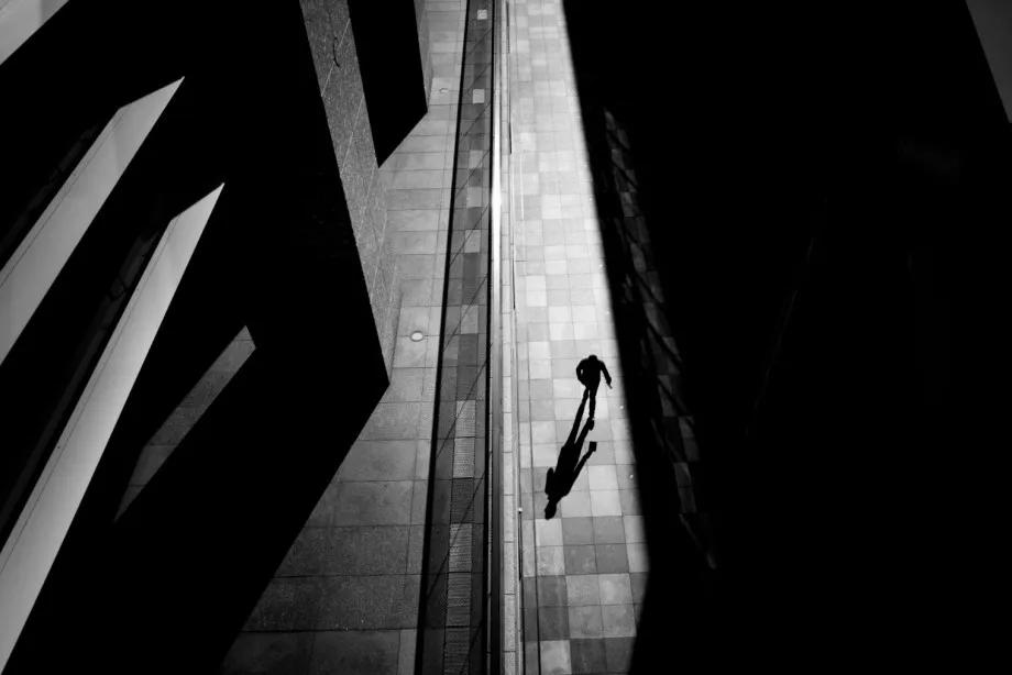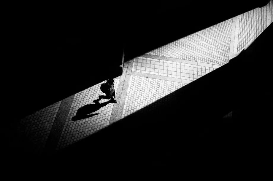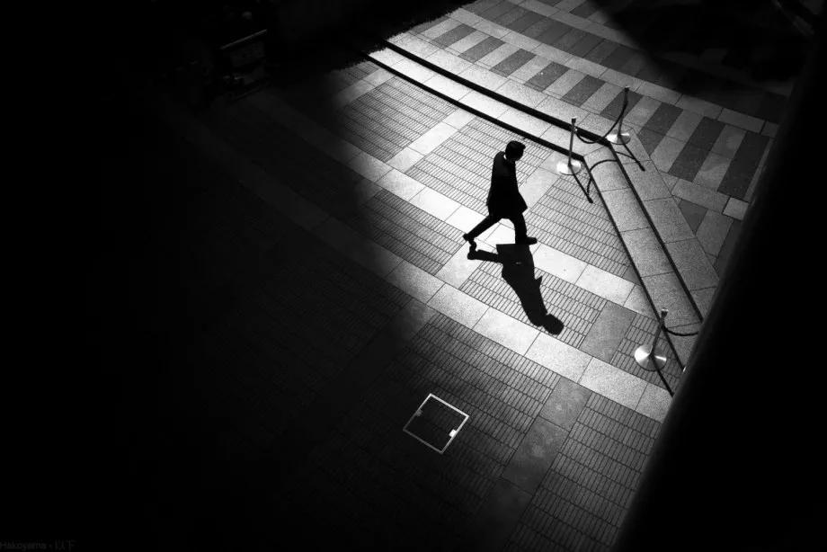 攝影圖片:攝影師Junichi Hakoyama十分擅長拍攝高對比度黑白街頭作品,善于利用場景中建筑物的線條,結合光影而形成明暗對比,加上充滿故事性的單個人物融入其中,便成就影像擁有黑白默片的快感。