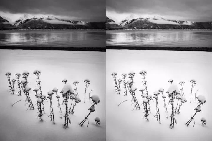 而如果你使用后期軟件,就可以做到只調(diào)整畫面某個(gè)部分的白平衡。用Lightroom 的例調(diào)整筆刷工具,或 Photoshop 的圖層蒙版,都可以做到只改變山峰的色溫: