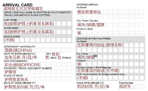 中國公民在結束菲律賓觀光旅游,于機場辦理出境登機手續前,應先交納機場稅,然后到訂購返機票的航空公司柜臺前辦理出境登機手續,領取登機卡和行李卡,同時向航空公司工作人員遞交出境卡。出境卡的填寫內容同入境卡基本相同。