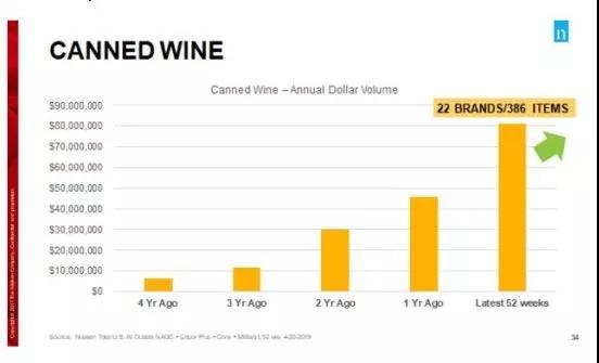易拉罐葡萄酒的銷量也是火箭般地往上漲,尼爾森數據顯示,截至2019年6月15日的52周內,罐裝葡萄酒在場外渠道的銷售額為7千萬美元,去年增長了69%,而在2012年,易拉罐葡萄酒的年銷售額只有2百萬美元。