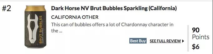 不要以為易拉罐葡萄酒都是不上檔次的廉價貨,前不久,美國《葡萄酒愛好者》雜志發布了2019年全球10大最具性價比葡萄酒,其中第二名就是加州Dark Horse酒莊出產的一款易拉罐裝起泡酒,《葡萄酒愛好者》給出的評分是90分,在美的售價為6美元。