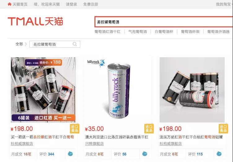 在天貓商城上搜索“易拉罐葡萄酒”,只出現了三款商品,月售量也很一般。