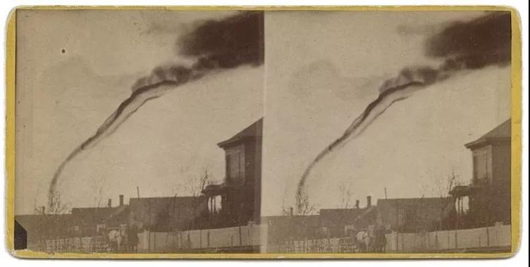 目前最早可知的龍卷風照片是在美國堪薩斯州拍到的。1884 年4 月26 日,一陣龍卷風緩慢地刮過堪薩斯州的安德森縣,這給了業余攝影師A.A. 亞當斯(A.A. Adams)設置他箱式相機的機會和時間。