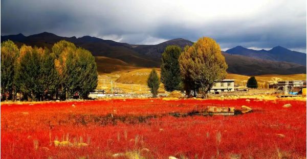 早上:8:30乘坐觀光車出亞丁景區,后乘車至稻城后經桑堆鎮觀【紅草地】(注:紅草地為季節性景觀,只有在每年的9月底到10月初才能看到此處的草原呈紅色),在秋天的時候,配合上后面泛黃的樺樹,倒映在水塘中,是許多書上所介紹的美景,之后翻越古冰川遺跡海子山到達丁真家鄉--理塘。