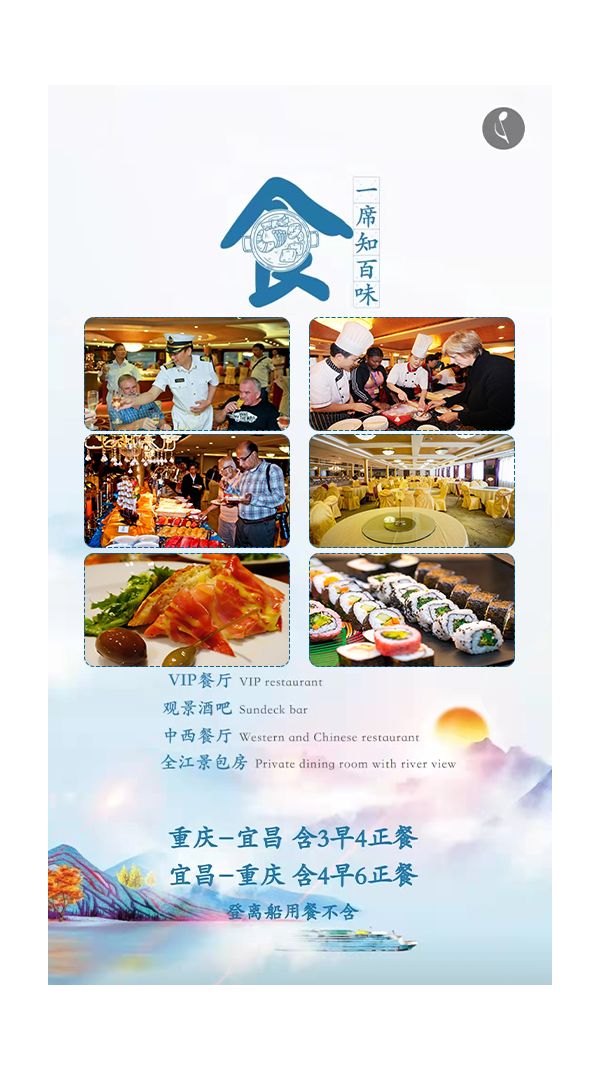 07:00——早餐成人:含餐 兒童:含餐游船2樓中西餐廳享用豐富的自助早餐。