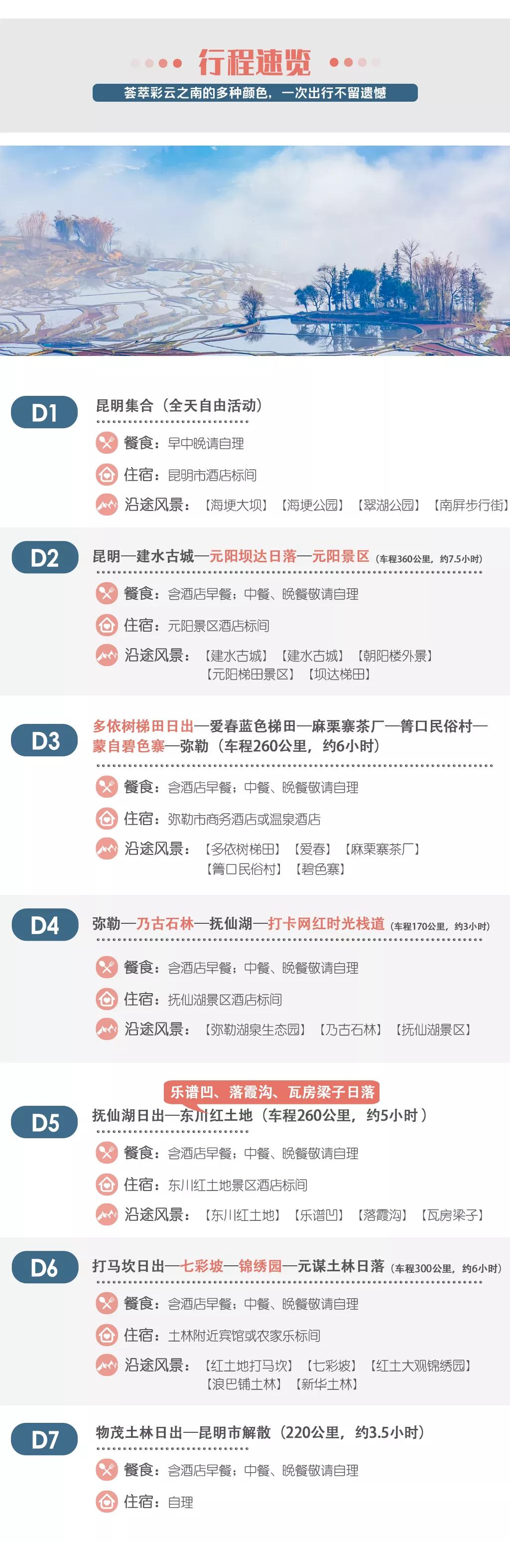 3、接站服務:2人及以上同時報名同一航班/車次,贈送昆明市區接機/接高鐵站服務一次。接機/接高鐵站的工作人員會在您出發日期前一天21:30之前向您推送消息并與您聯系,如果超過時間沒有接到任何通知,請及時與導游或報名處聯系。(節假日用車人數較多情況下客人等待時間可能會延長)。