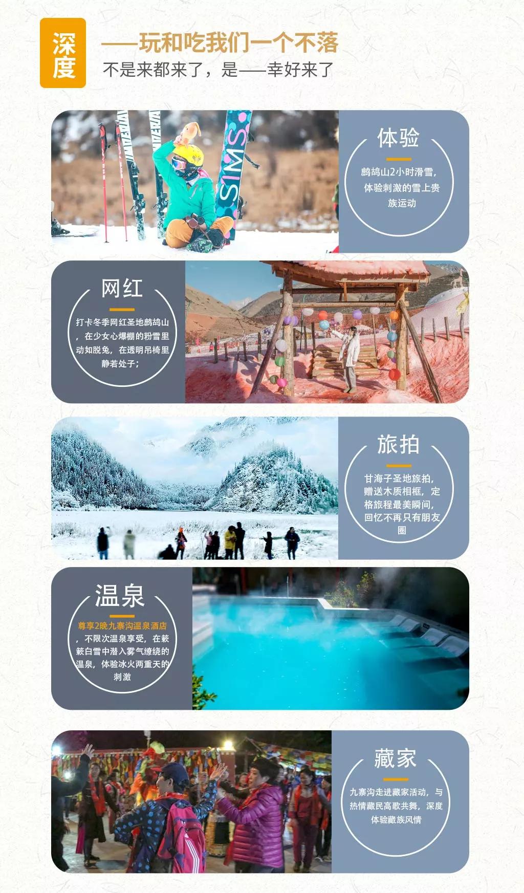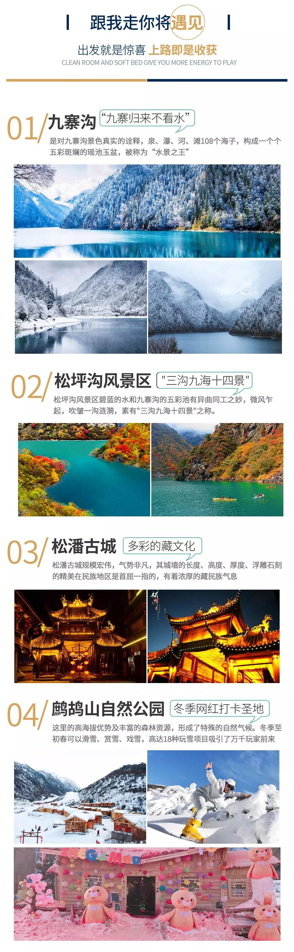 當日行程:九寨溝得名于溝內有九個藏族村寨,以“九寨六絕”——翠湖、疊瀑、彩林、雪峰、藏情、藍冰而聞名天下。遠望雪峰林立,白雪皚皚;近看碧水澄澈,清可見底;除卻如夢似幻的自然景觀,還有藏家木樓、晾架經幡、棧橋、磨房、藏族習俗及神話傳說構成的人文景觀,也因這不二的美,你能在這里見到許多熱門影視劇里的取景場地。冬季的九寨溝變得尤為寧靜,也更具詩情畫意,山巒與樹林銀裝素裹,瀑布變成了一幅幅巨大的天然藝術冰雕如此潔白而高雅的世界,錯開擁擠的游人,卻能收獲一個觀賞九寨六絕之“藍冰”和“雪峰”的最好時機。