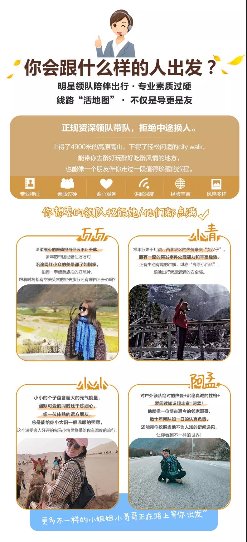 私人訂制:我們業務范圍囊括了全國各大城市,川西、西北、東北,在路上永遠有我們的身影。我們將為每一個有定制需求的你策劃出獨屬于自己的完美旅行。