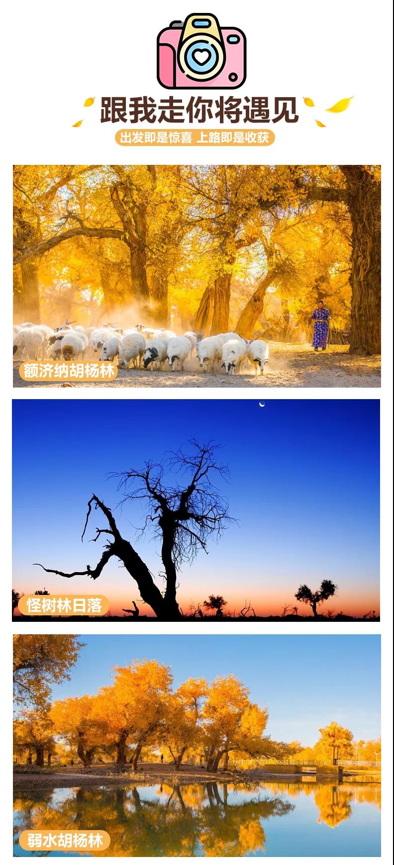 隨后我們在【額濟納胡楊林景區】中自行游玩攝影創作,胡楊有“生而一千年不死,死而一千年不倒,倒而一千年不朽”的說法,被世人稱為英雄樹。千姿百態的胡楊遍布在沙漠中,漫步輝煌的金秋胡楊林,用鏡頭記錄這中國最美的秋景;或者去找尋導游所說的一樹三葉的神奇景象——“幼樹葉如針似柳眉、壯齡樹葉酷似白樺、老年樹葉橢圓”,胡楊、藍天、來自大漠腹地的風聲襲來之時,胡楊林便泛起黃澄澄的層層漣漪,顯盡大西北秋冬那紅盛翠減的獨有風情。張藝謀的大片《英雄》中張曼玉與章子怡身著紅衣在這漫天的金色胡楊中打斗,踱步在胡楊林,熒屏內的唯美畫面一一浮現。