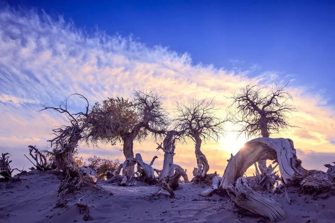 隨后我們游覽約一小時【怪樹林】,這里幾十年前是一片原始森林,由于水源不足等自然因素,大面積的胡楊樹木枯死。如今,枯木東倒西歪,神態各異,因此當地人稱之為怪樹林。我們將在怪樹林欣賞大漠落日,看滾滾落日從地平線上姍姍落下,形態各異的枯枝在大漠上畫出蜿蜒的影子。