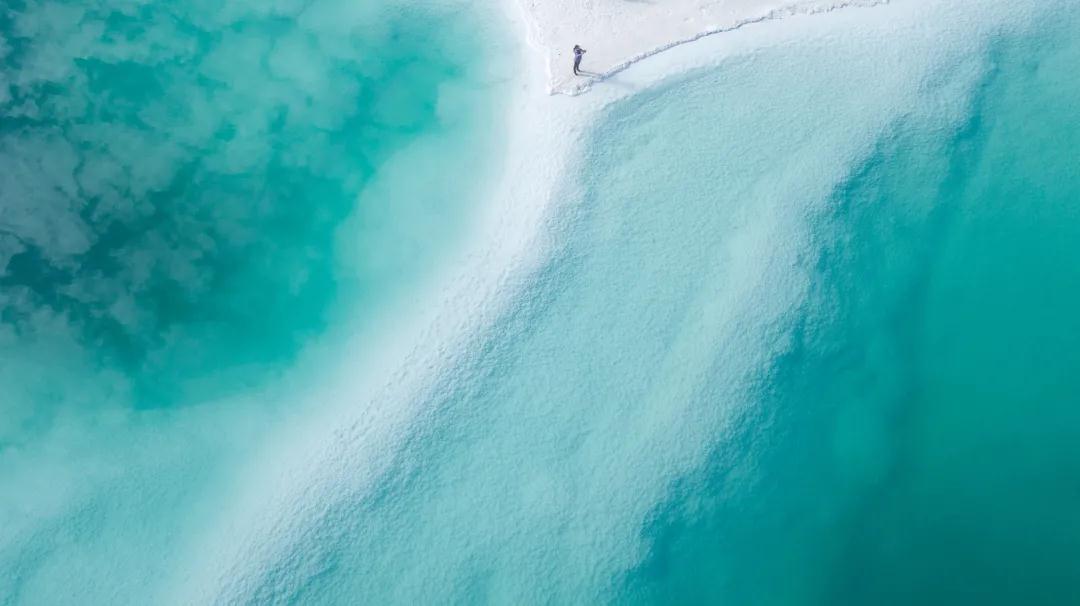 在水上雅丹不遠處便是【東臺吉乃爾湖】。東臺吉乃爾湖被稱為“中國的馬爾代夫”,湖水呈現純正的蒂芙尼藍;乃爾湖岸邊盡是覆蓋著的白色結晶,湖周圍是大片的雅丹地貌,搭配上顏色干凈到極致的湖水、西北特有的廣闊無垠的天空,純粹而強烈的視覺沖擊,這方圓百里大漠戈壁無人區的珍寶明珠,這只屬于大自然的神秘顏色,讓你仿若來到了世界的盡頭,讓你感受一種歸于自然的內心平靜。