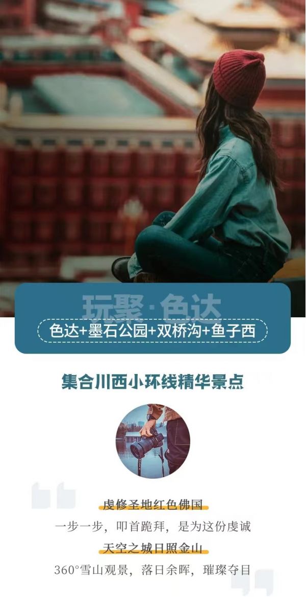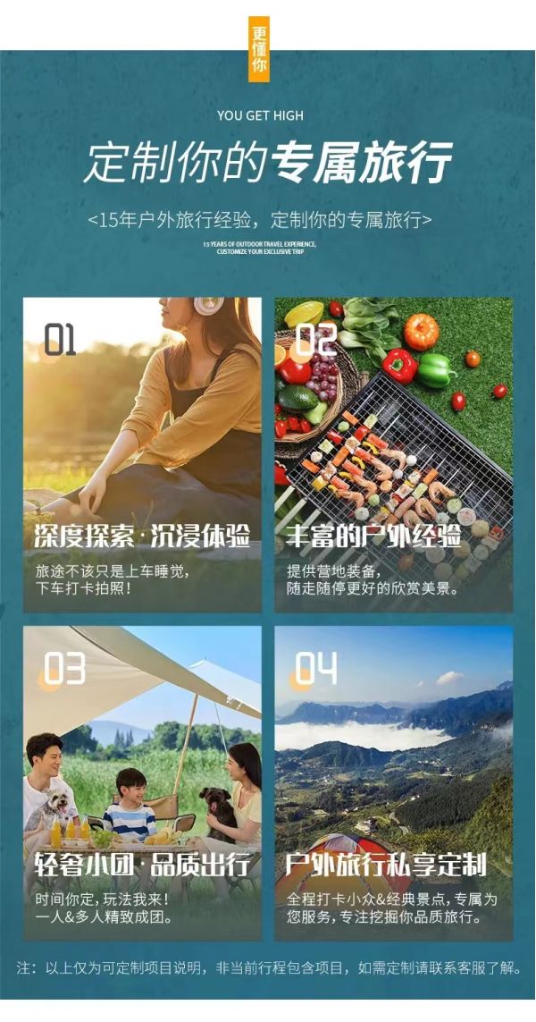 私人訂制:我們業務范圍囊括了全國各大城市,川西、西北、西藏、新疆,在路上永遠有我們的身影。我們將為每一個有定制需求的你策劃出獨屬于自己的完美旅行。