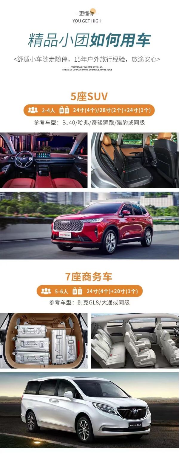 交通:2-8人VIP私享小團全程舒適SUV/商務車出行;車型大小根據實際人數安排,且由駕駛經驗豐富的司機為您的出行保駕護航,報價包含車費、油費、停車費、維修費及司機勞務費。