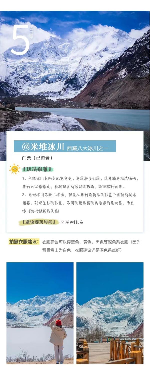然后我們來到位于然烏湖北面的著名的【米堆冰川】,冬季更是觀看藍冰的最佳時機,米堆冰川位于藏東南的念青唐古拉山與伯舒拉嶺的接合部,這里是我國最大季風海洋性冰川的分布區。該冰川常年雪光閃耀,景色神奇迷人。山上冰川融化出涓涓細流在千百年的努力下漸漸割開了冷硬的凍土,孕育出了川藏線的明星然烏湖,也成了河谷地帶人們安居樂業的希望所在。