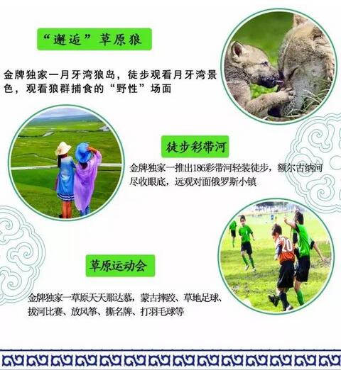 三、全程門票費(fèi)。(金帳汗門票、敖魯古雅使鹿部落門票、莫爾道嘎森林公園門票、彩帶河門票、滿洲里國(guó)門門票、月牙灣狼島、訪問原始游牧部落)