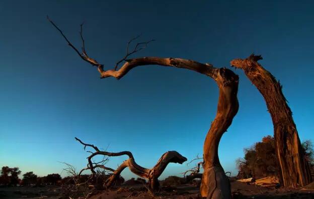 這里是一大片死去的胡楊林。胡楊千姿百態(tài)的造型在這里體現(xiàn)得淋漓盡致,有的直刺藍(lán)天,有的彎曲盤(pán)旋,還有的轟然倒下,散落了滿地的樹(shù)干,裸露的枯根在空中扭曲著,是最能出佳作的地方,拍攝黃昏日落美景。