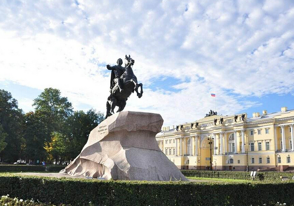 十二月黨人廣場和青銅騎士像】(約15分鐘)坐落在圣彼得堡涅瓦河岸,鄰近海軍司令部大樓,廣場中央有一個圓形的大草坪,中央豎立著彼得大帝青銅騎士像,它是由普希金的抒情詩而得名。這里是城市的標志和歷史印記點。