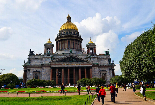 圣伊撒基耶夫大教堂】(外觀約15分鐘)也叫圣伊薩基輔大教堂,始建于1707年,已有300年歷史。廳和殿皆以大理石裝飾,且有以貴重的藍、綠孔雀石材質建成的立柱,美不勝收。被認為是僅次于羅馬梵蒂岡圣彼得大教堂、德國科隆大教堂的世界第三大教堂。伊薩基耶夫教堂,是圣彼得堡的象征。
