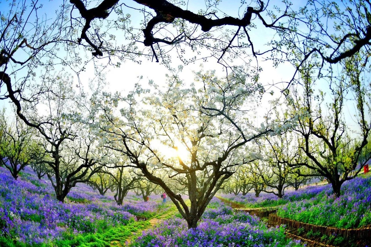 4、春季梨花盛開的季節,這里是一片冰清玉潔的世界,白色的梨花紫色的二月蘭,一望無際的白紫交融的——梨蘭會;