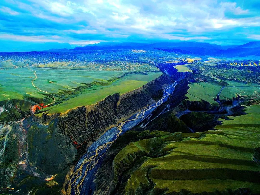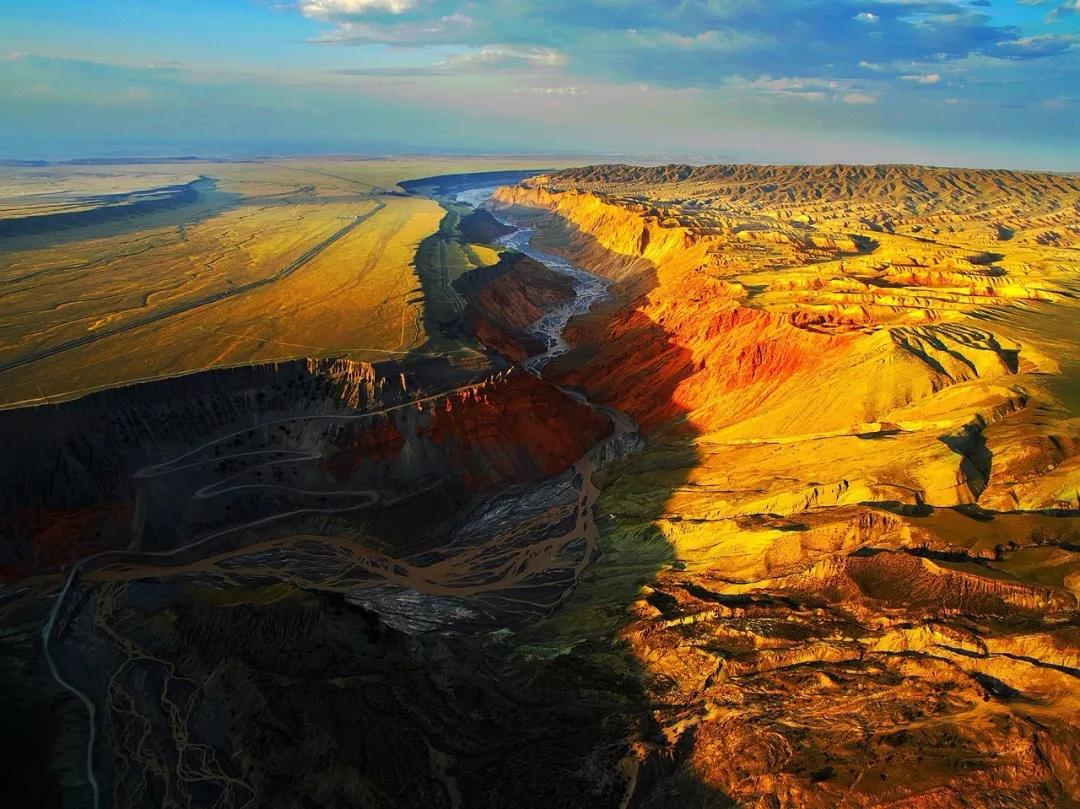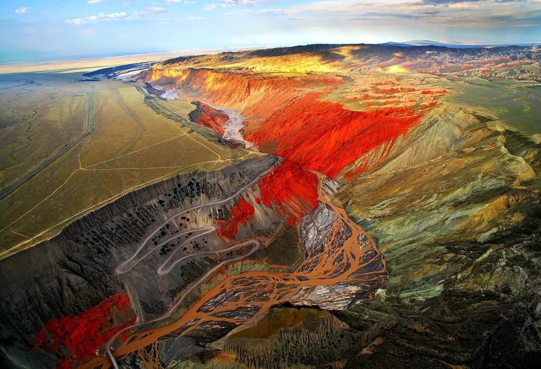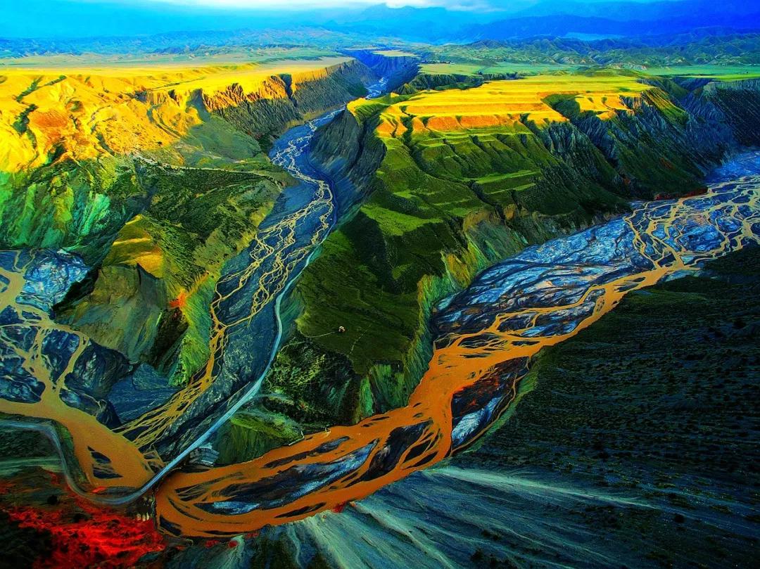 從高空看,安集海峽谷的色彩異常豐富,河流切割大地,將不同顏色的巖層沖刷溶解,形成了一幅絢麗多彩的大地抽象畫景觀。與其他一些色彩灰冷單調的峽谷相比,擁有紅山、黛崖、青峰、綠島、碧水等豐富色彩的安集海峽谷,就像一條彩帶飛舞在天山北坡腳下,成為中國峽谷群中一條色彩最豐富的大峽谷。