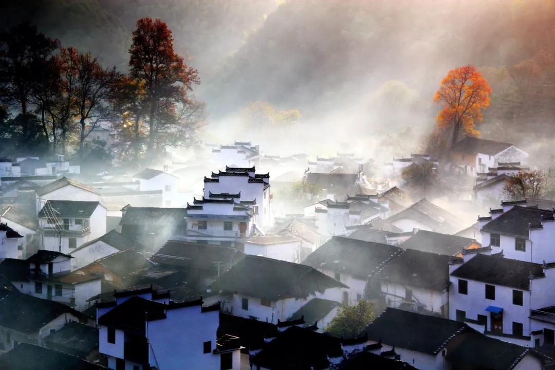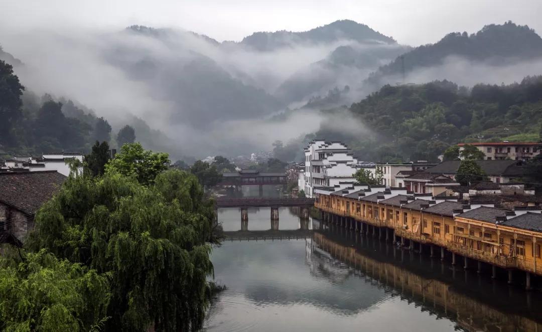 數百幢明清徽派古建筑依山傍水、錯落有致地分布在瑤河兩岸,飛檐翹角,粉墻黛瓦,掩映在青山綠水間,宛若置身于一幅清麗的山水畫中。