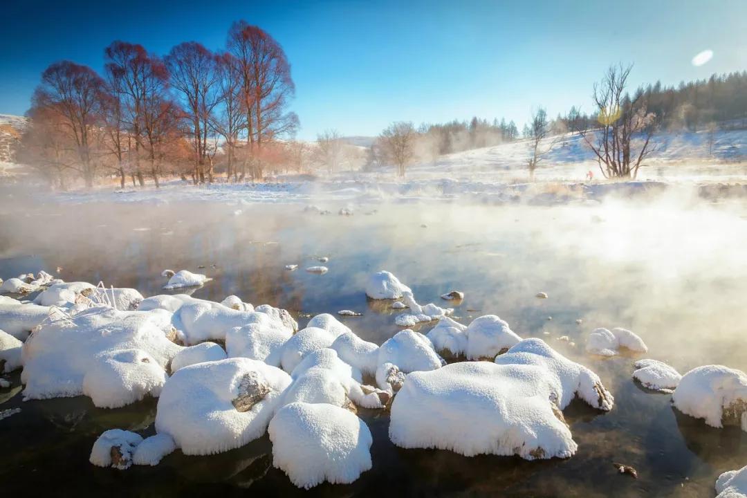 “不凍河”其實是哈拉哈河的一段由于附近有大量的地熱存在當上下游都是冰凍三尺時這里的河水不僅不會結冰還生長著水草,水面冒著騰騰熱氣