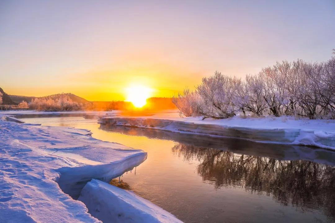 冬天的不凍河是最美的夕陽西下河面上霧氣繚繞,兩邊還有霧凇宛如人間仙境