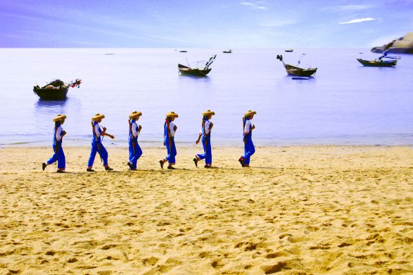三娘灣的沙灘是世界上最美妙的沙灘,清澈透明的海水隨海風均勻的節拍, 三娘灣將黃燦燦的的沙粒沖刷成平整細膩的肌膚,一片一片讓人不忍心去踩,而又忍不住要去踩,踩了之后又讓人不禁后悔,后悔之后便是茫然,便是不知所措。