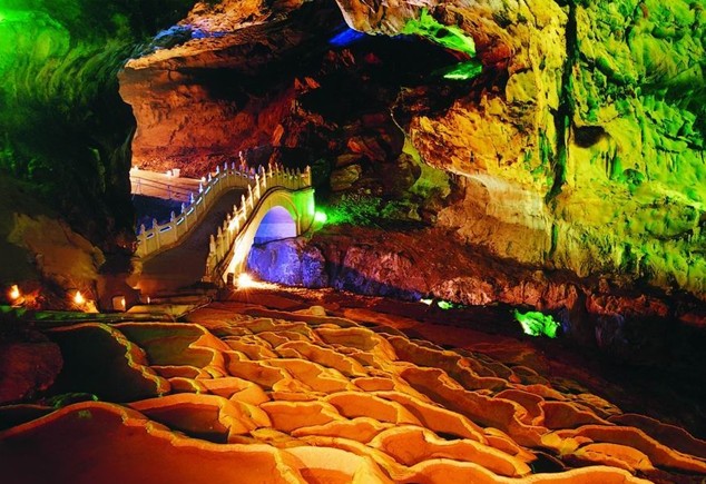 洞內有無數千姿百態,瑰麗多彩的鐘乳石,游覽范圍共分三層:上中兩層為陸地層,廳堂高大寬闊,巖壁堅固,雄偉壯觀,“瀑布”“山林”“谷”“田園”“瑤寨”百花爭艷,鳥飛云走……;下層是一條地下暗河,由北向南蜿蜒1500米,經過三個美麗的峽谷,穿過四座山頭底部,河面寬1.6米,水深1-7米,兩岸奇景密布,巧奪天工,美不勝收。有洞中之寶”金雞報喜”飛象過河”還有地下河最高最大,版權所有山東聊城聊之旅國際旅行社有限公司,轉載必究!一物兩景的“壽星公”“飛瀑奇石”“花鳥神閣”……。各處自然美景無不讓人吧為觀止。樂而忘返!