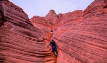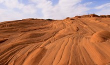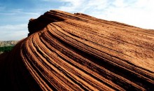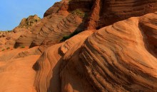 波浪谷是一種紅砂巖地貌,因巖砂上的紋路像波浪而得名,巖石上纖細的紋路,揭示了沙丘沉積的運動過程,紋路的變化反映出每一層砂巖隨著沉積礦物質的含量不同,而產生的顏色深淺差異,紅色主要是由鐵和錳的氧化而產生,這些顏色往往在交錯處和角落里形成更加復雜與抽象的圖案。它的紋理線條比較清晰,像是一層層的波浪,也圍繞著波浪起伏的小山丘形成了不同的走向,極其具有觀賞性。