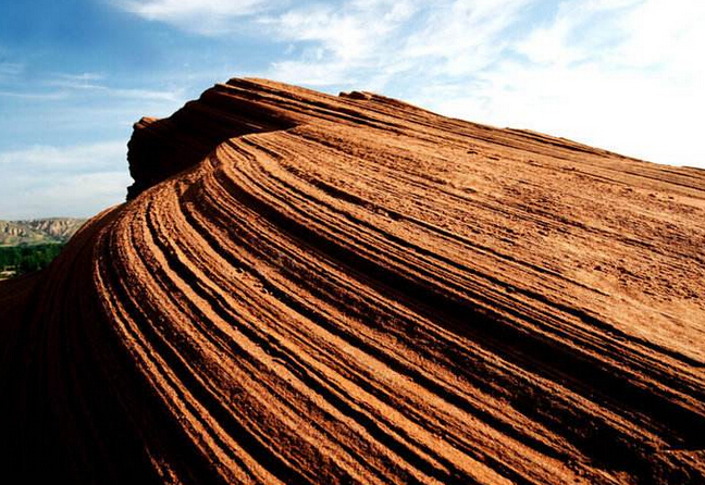 龍洲的紅砂巖被厚重的黃土所覆蓋,經過數千萬年的風蝕和水蝕,顯露出孤立的山峰和形態各異的奇巖怪石。其中以波浪谷最為著名,波浪谷展示的是由數百萬年的風、水與時間交織,雕琢砂巖而成的奇妙世界。波浪谷巖石的復雜層面,是由一億五千萬年前侏羅紀就開始沉積的巨大沙丘組成,沙丘被一層層浸漬了地下水的紅沙所覆蓋,天長日久,水中的礦物質把沙凝結成了砂巖,形成了層疊狀的結構,正如時光在靖邊大地上留下的指紋。