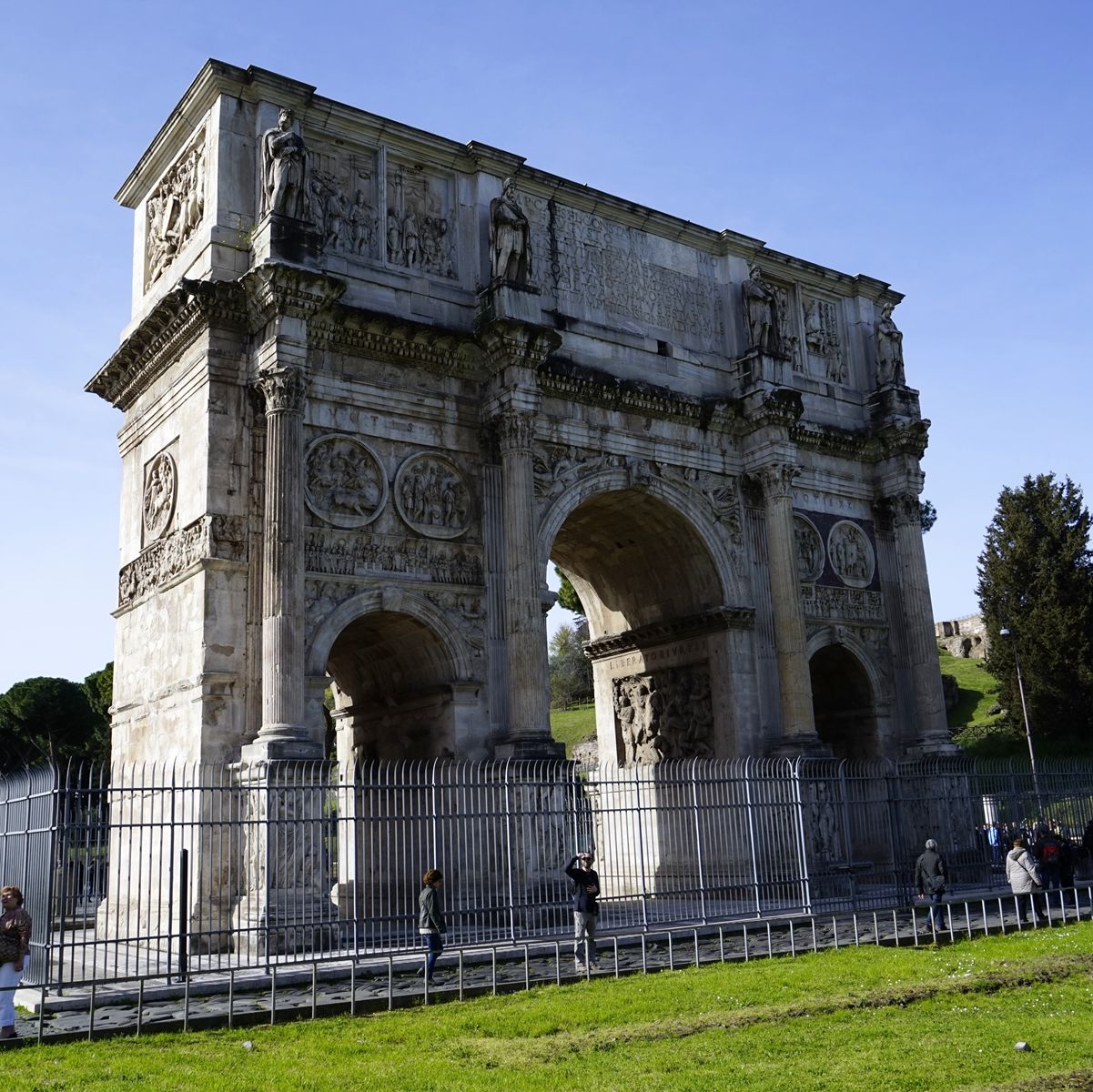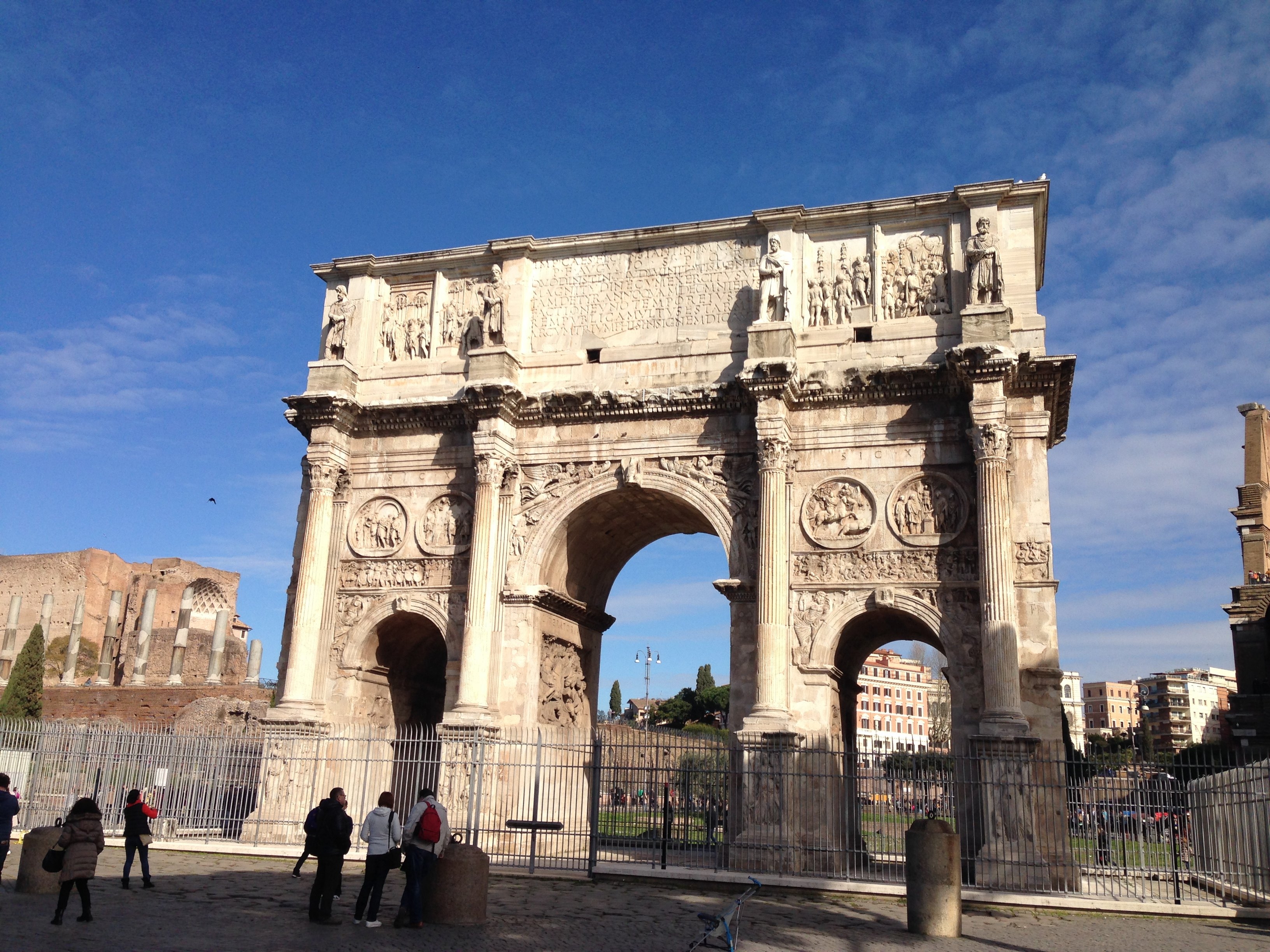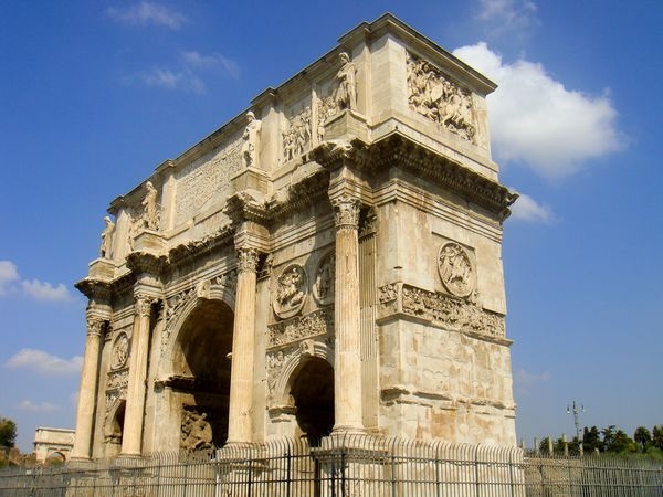 這座拱門上面的絕大多數(shù)裝飾品其實都是取白于以前的皇帝們所建造的各種建筑物,這也表明羅馬的藝術(shù)已經(jīng)開始走下坡路了。所以君士坦丁凱旋門是羅馬三座凱旋門中建造最晚的一座。