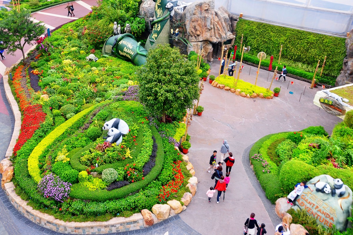 公園有前后兩個入口,從公園的正門進入會首先經過鯨豚保護廣場,繼而到達綠野花園及兒童王國,再乘坐纜車就可以到達山上的機動游戲區;如果從后門口大樹灣的入口進去,則會通往集古村,乘登山電梯再經過急流天地,便可達到山上的機動游戲區。從后門入園(大樹灣的入口)進去可以避開人群,逆向而行。