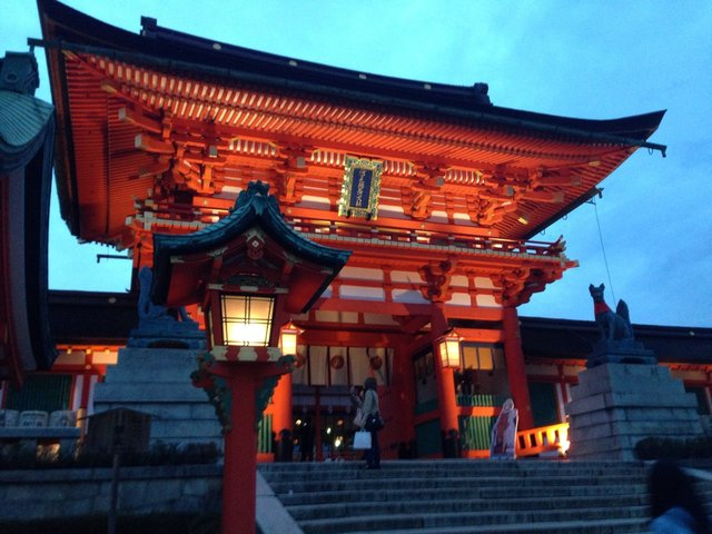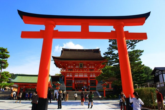 伏見稻荷大社的入口,矗立著由豐臣秀吉于1589年捐贈的大鳥居,后面便是神社的主殿及其他建筑物。在神社里,還能見到各式各樣的狐貍石像,這是因為狐貍被視為神明稻荷的使者。狐貍臉形的繪馬是這里的一個特色。