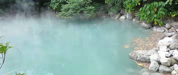 地熱谷溫泉清澈見底,藍綠色的溫泉水溫度約在90攝氏度到100攝氏度,水質是屬鹽酸酸性泉,因此,地熱谷又稱青磺泉。