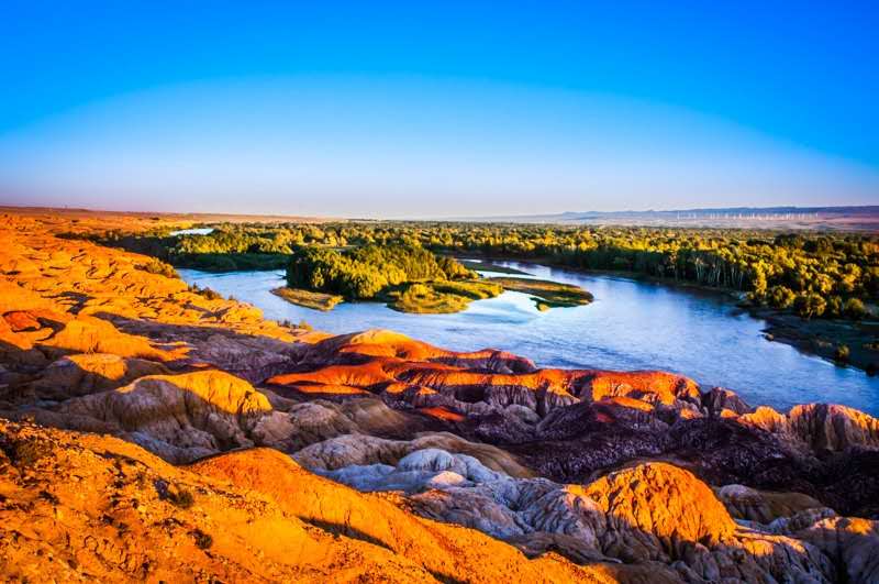 五彩灘風景區前有大型的風力發電網站。北岸山勢起伏、顏色多變,其是由激猛的流河侵蝕切割以及狂風侵蝕作用而共同形成。由于河岸巖層間抗風化能力的強弱程度不一而形成了參差不齊的輪廓,這里的巖石顏色多變,且在落日時分的陽光照射下,巖石的色彩以紅色為主,間以綠、紫、黃、白、黑及過渡色彩,色彩斑斕。每當刮風的時候,溝壑里、巖石下,到處都會發出長短不一、高低不同的怪叫聲。