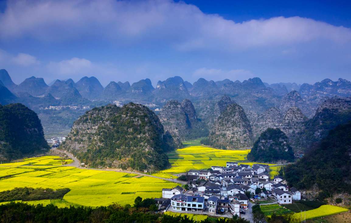 萬(wàn)畝油菜花:萬(wàn)畝油菜花盛開(kāi)在烈烈暖陽(yáng)下,在層疊的峰林間,一座座峰林在初春的日光下延伸到天邊。山下是燦爛明黃的大海般的油菜花田,不知名的村寨掩映其中若隱若現(xiàn)。遠(yuǎn)處青山如黛,近處大片大片的油菜花開(kāi)得熱烈燦爛。