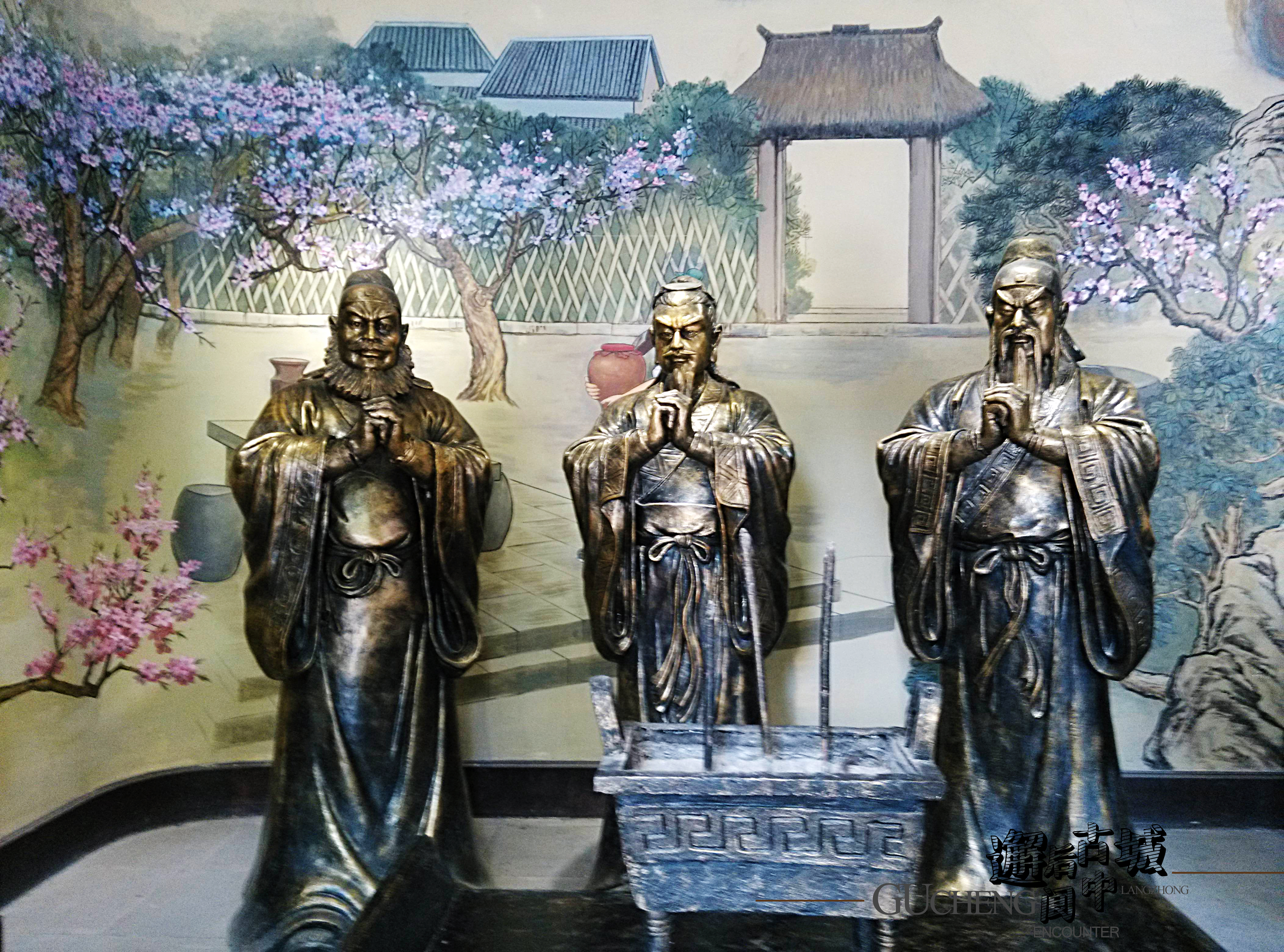 踏上陡峭的臺階走上二樓,劉、關、張桃園三結義的雕塑面江而立,率先映入眼簾。