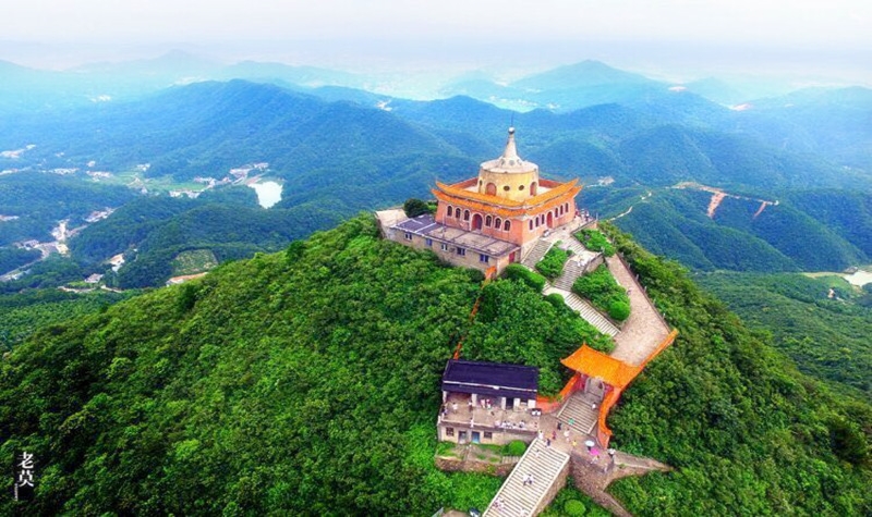 韶峰頂上唐時有韶峰庵,后來有仙頂靈廟,俱毀。1993 年在峰頂修復了古寺廟,由中國佛教協會會長、著名書法家趙樸初題詞:韶峰古寺。寺殿門聯為:“舜帝南巡奏揚韶樂傳天下;紅日東出播種福田在人間。寺分上下兩層,下層為一大廳,廳正中南向塑有舜帝金身,北向則為娥皇、女英。舜帝顯得雍容慈祥,二妃眼含凄切。舜帝左右靠墻處,有彩塑四大金剛,三面墻頂塑有二十四位諸天、十八位羅漢,神態、裝束各異,栩栩如生。上層又作觀日臺。韶峰寺——觀日臺(觀日閣)采用仿金字塔造型,底邊四角均為75°。這種結構穩定、堅固、抗震、防強風,又能收到金字塔效應:人處塔中,身心格外舒暢,并產生一種奮發向上的力量。同時,韶峰寺——觀日閣又融入了中國傳統文化中“天圓地方”的意蘊:其下部為正方形,上部為圓錐形,寺體由方而圓,愈上愈尖,至頂部綴有一顆錚亮的銀色金屬球,球上,一柄鋼針直插藍天。