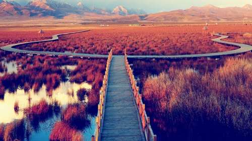湖水透徹的藍(lán),是那種無法形容的純凈;繾綣在水天之間的云彩,有著魔力般妖艷。令人想越過棧道一直走到湖中心去,或許那里,會有更大的幸福。