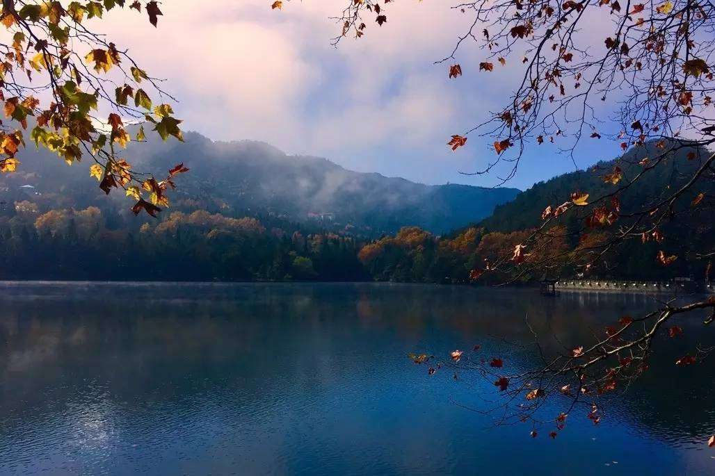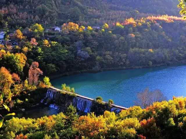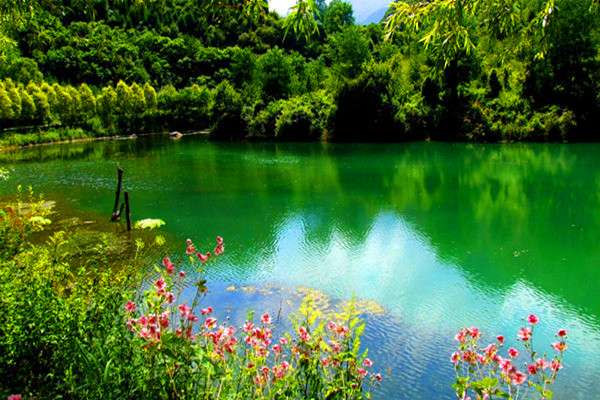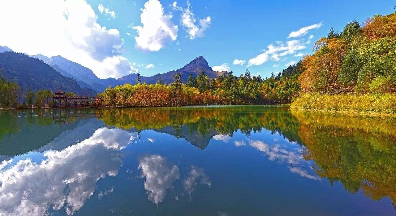 官鵝溝水美。13個大小不等、形態各異的湖泊,尤如一串綠色的珍珠鑲嵌在溝內,湖水清澈透底,隨湖底地貌高低呈不同顏色,那些倒映在湖中的古樹象一條條巨龍臥在湖底。藍天白云和青山古樹,映入湖中,使天地渾然一體,沒有界限。