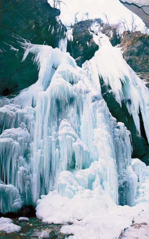 尊敬的游客朋友,剛才我們欣賞了蔚然壯觀的石壁天河,馬上就要看到風韻萬千的白石山了。峰回路轉,一道瀑流忽然從天而降,猶如一條銀龍從空中飛下,悠悠忽忽,晃晃蕩蕩,神態瀟灑自如。細看這條瀑布,它是從幾十丈高的山崖頂上落下的,自古只有水往低處流,而這里的山崖兩側溝內無水,崖頂卻有瀑布,真是“水往高處流”。隨河風輕拂,它飄飄灑灑,飄逸而矯健,給人以無限聯想,“飛流直下三千尺,凝似銀河落九天”正是它的傳神寫照。潔白的瀑流擊在棱角突兀的巖石上,濺起串串晶瑩的珍珠,向四面八方飛散而去。道道涓涓細流,化成條條白龍,從巖石的四周蜿蜒游去。在官鵝溝眾多的瀑布中,九天飛瀑以它的凌空飛瀉,瀟灑自如而獨樹一幟。