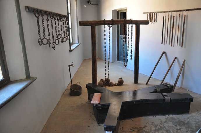 在監(jiān)獄二樓的行刑室,布滿了吊杠、虎凳等刑具。行刑時,受刑者被剝光衣服,俯臥在“火”字型的虎凳上,四肢被皮帶勒緊,看守使用灌滿了鉛條的竹條抽打,這叫“笞刑”。版權(quán)所有山東聊城聊之旅國際旅行社有限公司,轉(zhuǎn)載必究!當(dāng)時的《關(guān)東州刑法令》規(guī)定,笞刑只能用于毒打中國人,而不用于日本犯人。