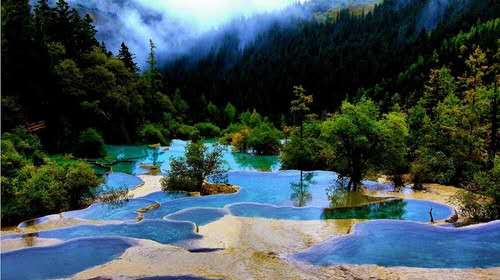 這一片景觀,還有緊傍森林的明鏡倒影池、掩映于杜鵑花叢間的婆蘿彩池和擁有彩池500多個,鈣化景觀中色彩最為豐富的爭艷池。