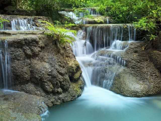 告別迎賓池,沿著曲折的棧道蜿蜒而上,可見到千層碧水沖破密林,順坡而下,在高約10米、寬約60余米的巖坎上飛瀉而來,形成數(shù)十道梯形瀑布,如珍珠流滾落,銀光閃爍;如水簾高掛,云霧蒸騰;如絲般緩流,舒展飄逸;如珠簾閃動,風(fēng)姿綽約。瀑布后有一座陡崖,多為馬肺狀和片狀鈣化覺積,凝垂欲滴,色澤金黃,使整個瀑布顯得富麗壯觀。經(jīng)太陽余輝點染,反射出不同的色彩,遠(yuǎn)望如彩霞從天而降,分外輝煌奪目,號稱“飛瀑流輝”。