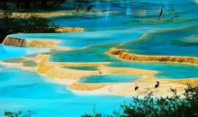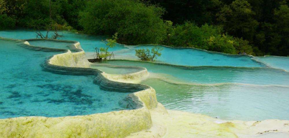 進(jìn)入黃龍景區(qū),首先看到的是一組精巧別致、水質(zhì)明麗的池群--迎賓池。池子大小不一,形狀奇特,色彩艷麗,錯落有致,四周山岳環(huán)峙,林木蔥蘢,山間野花競放,彩蝶飛舞。山間石徑曲折盤旋,點綴著觀景亭閣,倍添情趣。
