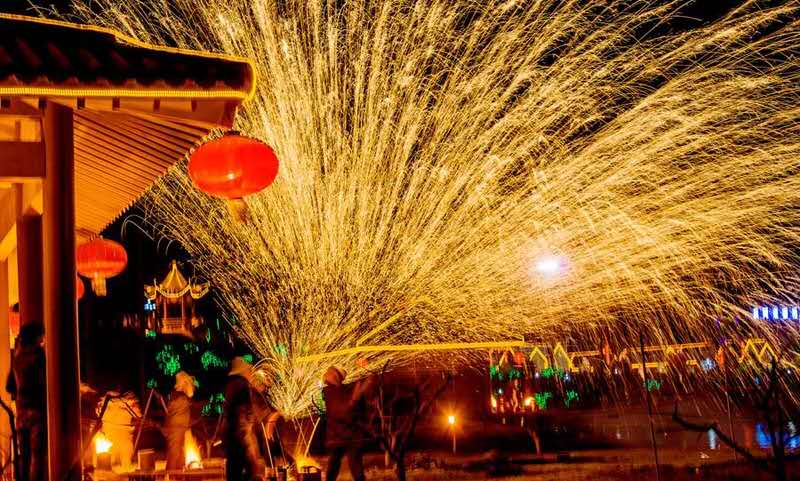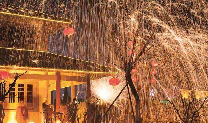 夜幕降臨時才是文化節(jié)的高潮部分,春節(jié)期間,省級非物質文化遺產(chǎn)千年絕技“打鐵花”在司徒小鎮(zhèn)內的人工湖廣場精彩上演,民間匠人用熔爐將生鐵熔化成數(shù)千攝氏度的鐵汁,拋起用力擊向天空,朵朵鐵花如天女散花,絢麗奪目,夜空之下,火星璀璨,帶來的是紅火和驚詫,也帶來了希望與憧憬,吸引大量游客前來觀看。最高峰時期,單日游客量最高達十五萬人,創(chuàng)造了多項晉城市城區(qū)景區(qū)接待量的新記錄,令周邊游客度過了一個熱熱鬧鬧的新年。
